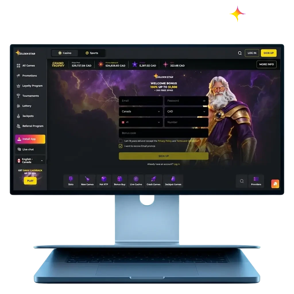 The Golden Star mobile website runs directly in your browser without requiring a download, giving Canadian players instant access to sports betting, casino games, and account features from any smartphone or tablet. The layout adapts to your screen size automatically, keeping navigation clean and touch-friendly across all devices.